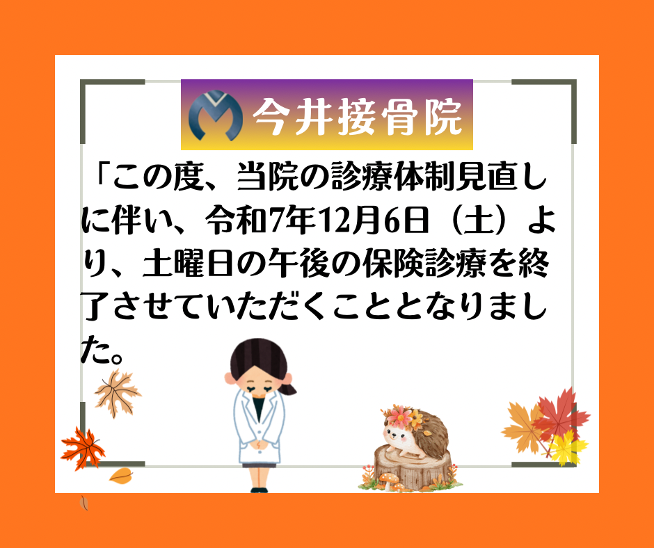 「この度、当院の診療体制見直しに伴い、令和7年12月6日(土)より、土曜日の午後の保険診療を終了させていただくこととなりました。